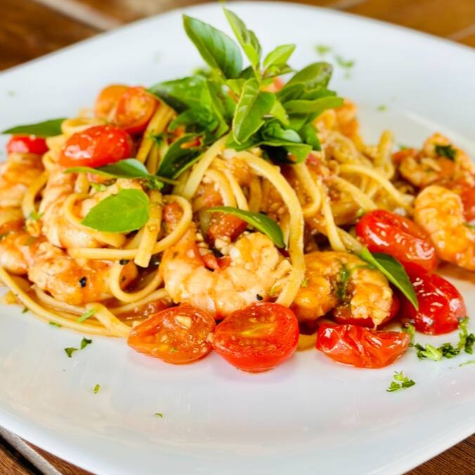 Camarões Salteados com linguine ao molho pomodoro com manjericão fresco.
