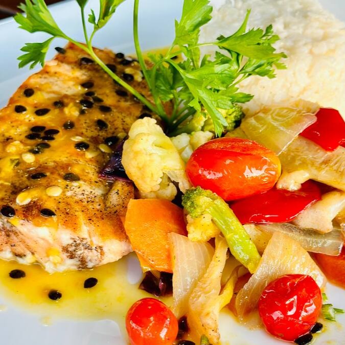 Filé de Salmão Grelhado ao Molho de Maracujá com legumes salteados na manteiga