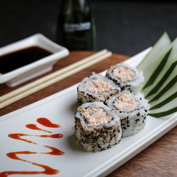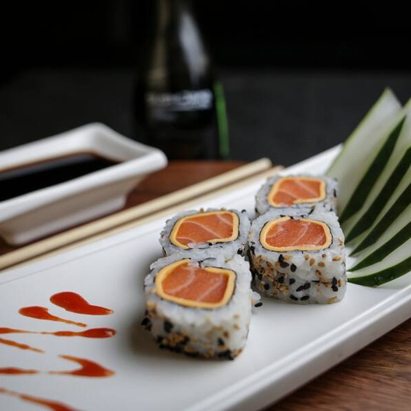 Rol de salmão e arroz com recheio de cream chesse e sweet sauce.