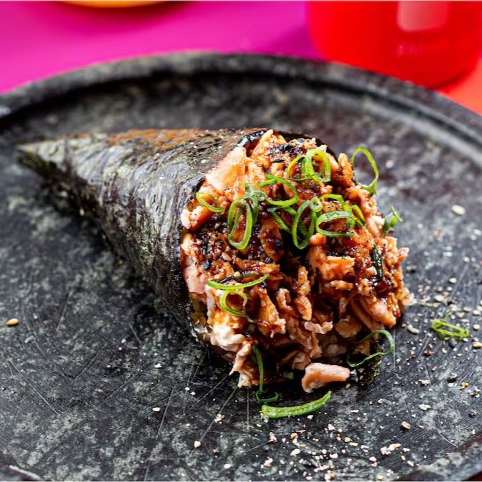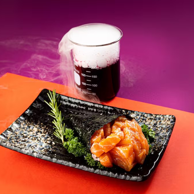 Cone de Alga Nori Recheado com Salmão Grelhado e Arroz.