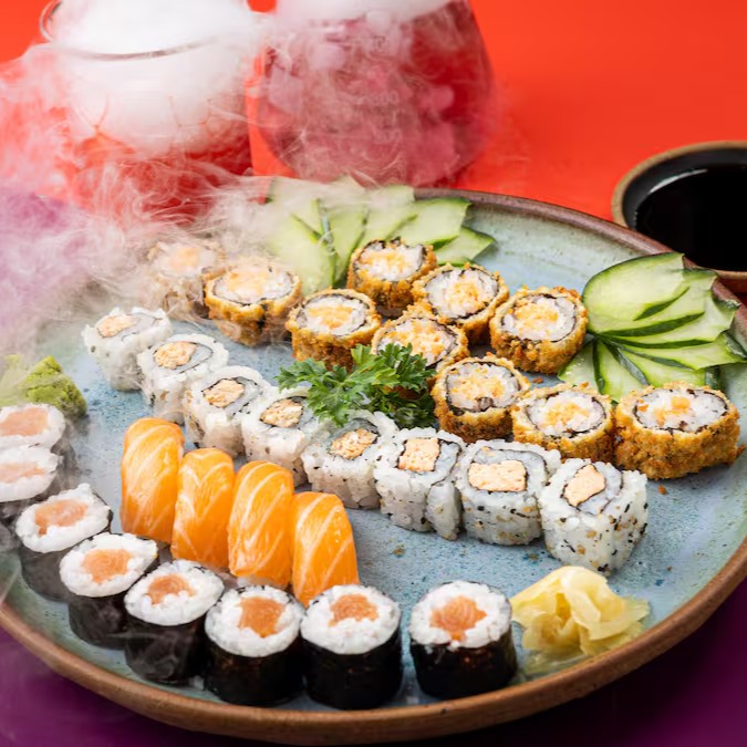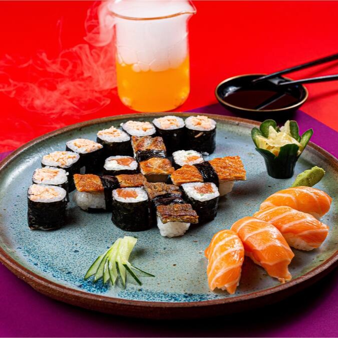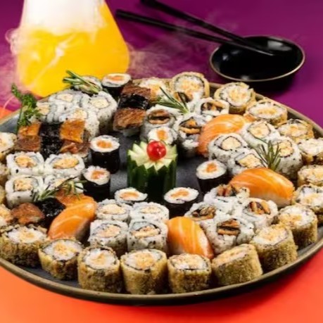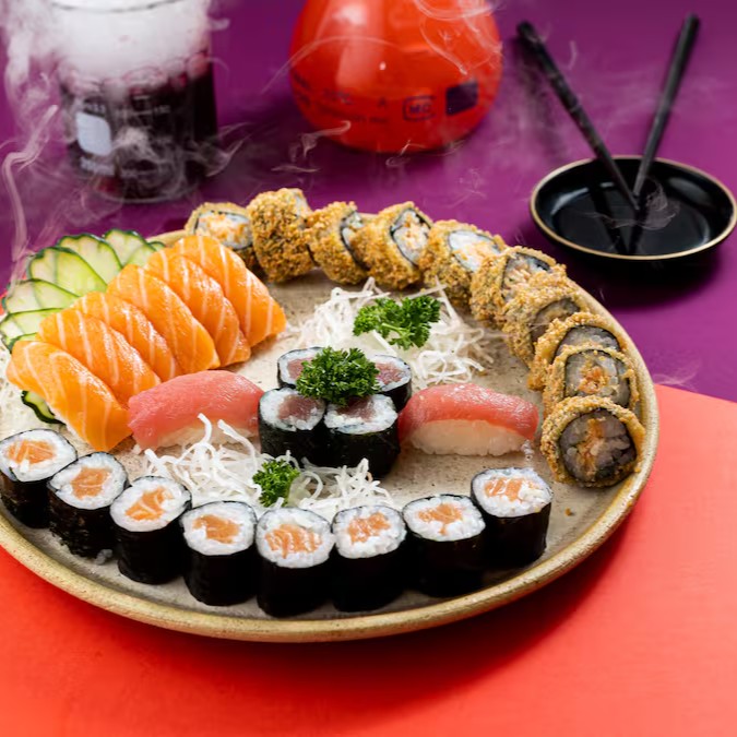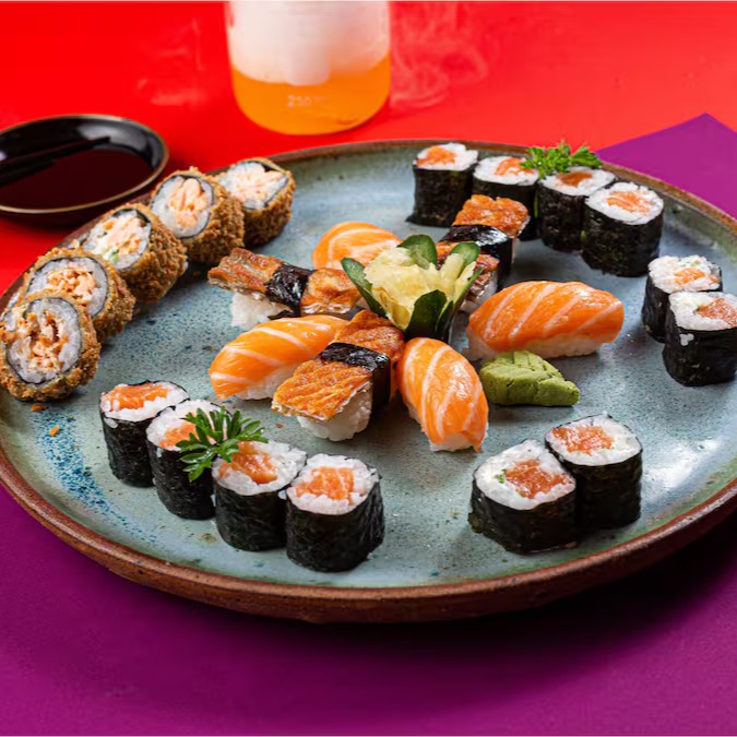 20 Hot Filadélfia, 4 Sushi de Salmão, 4 Sushi de Skin, 8 Maki de Filadélfia, 16 Maki de Salmão Grelhado, 8 Uramaki de Salmão Grelhado.