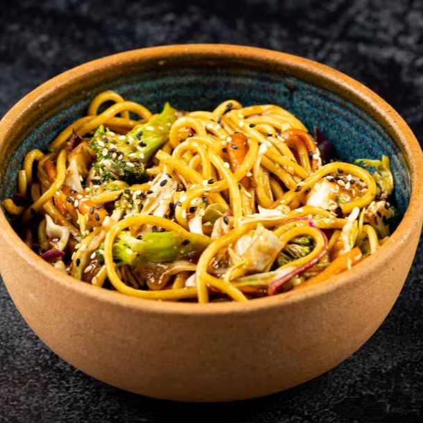 Macarrão Típico da Culinária Japonesa Preparado com Couve-flor, Brócolis, Óleo de Gergelim, Gergelim e Molho Adocicado.