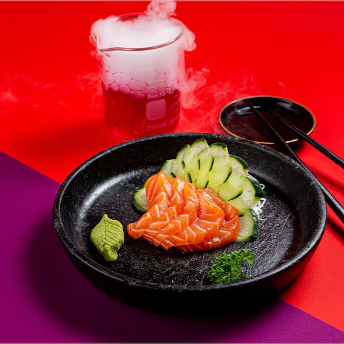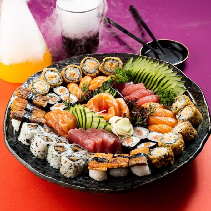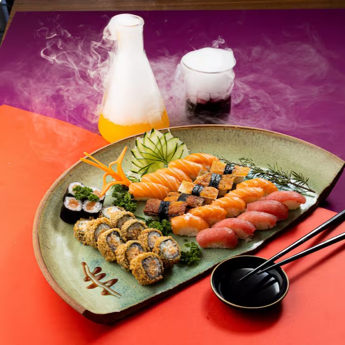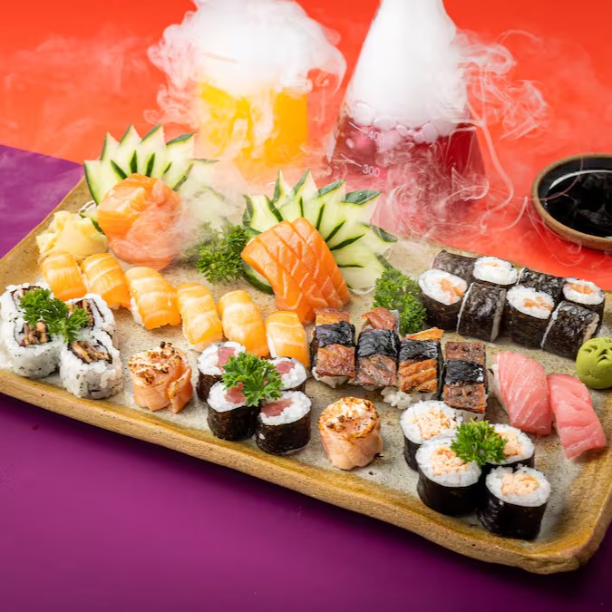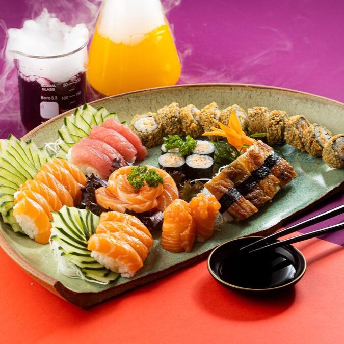 8 Sashimi de Salmão, 6 Nigiri de Salmão, 4 Nigiri de Skin, 2 Nigiri de Atum, 4 Uramaki de Skin, 4 Maki de Salmão Grelhado, 2 Jyo de Salmão, 4 Maki de Atum e 8 Maki de Filadélfia.