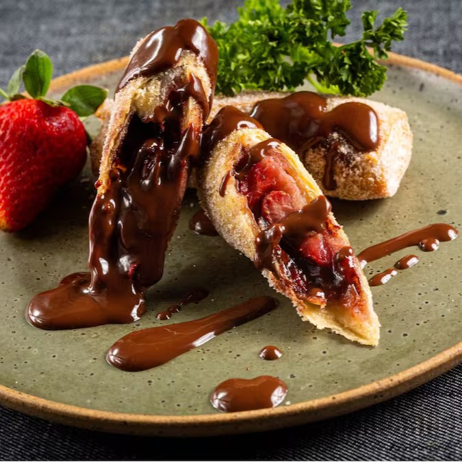 Rolinho Primavera recheados com morangos frescos e suculentos, e uma camada cremosa de Nutella. Se você é fã de sobremesas irresistíveis essa é a escolha perfeita!