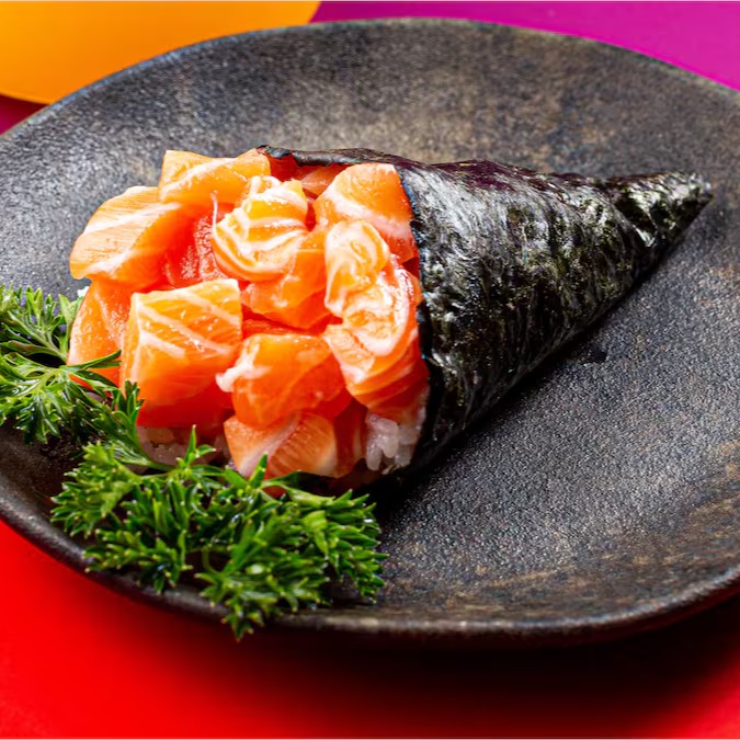 Cone de Alga Nori Recheado com Salmão e Arroz.