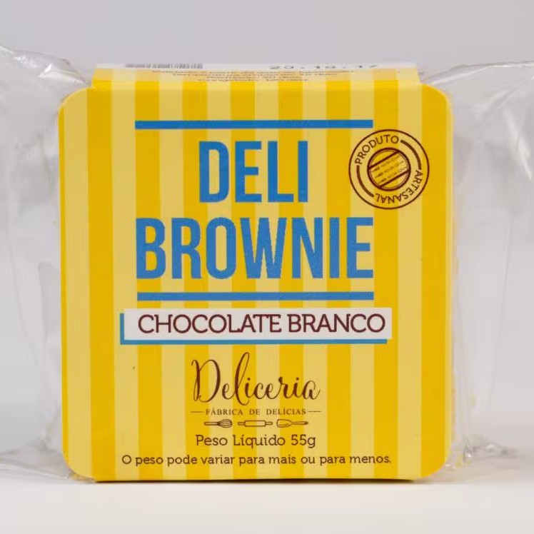 Brownie com Sabor Intenso de Chocolate Branco, com Pedacinhos de Chocolate Branco na Massa.