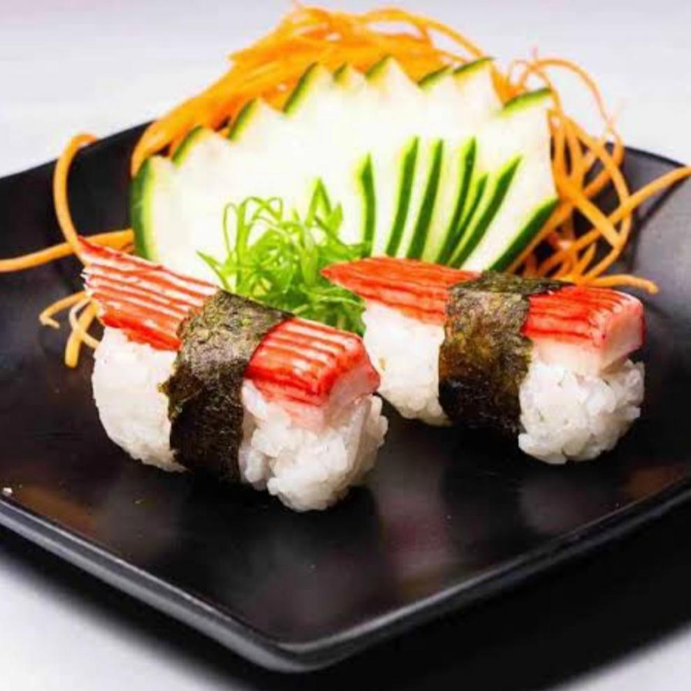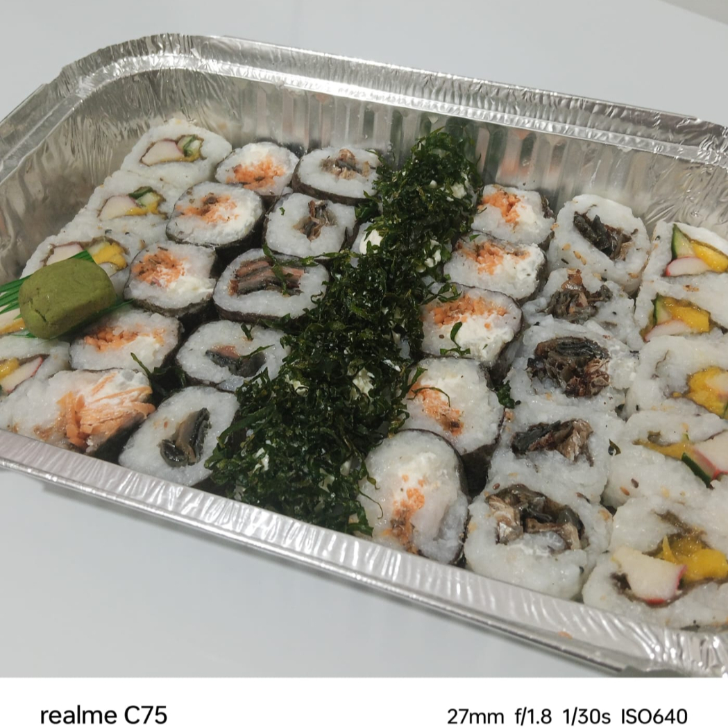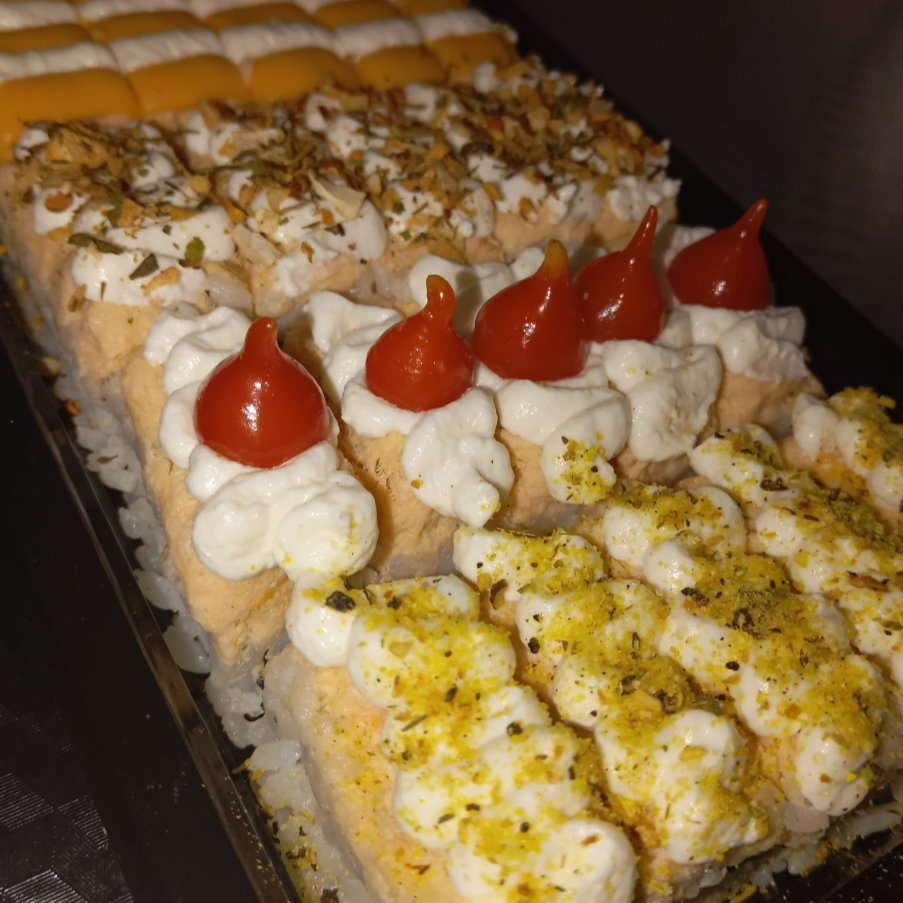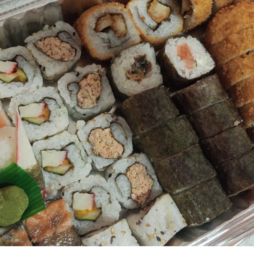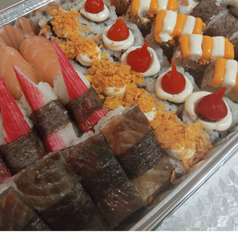 2 rolinhos salmão . 2 niguiri salmão , 2 niguiri skin , 2 niguiri kani , 5 uramaki com pimenta biquinho , 5 uramaki doritos