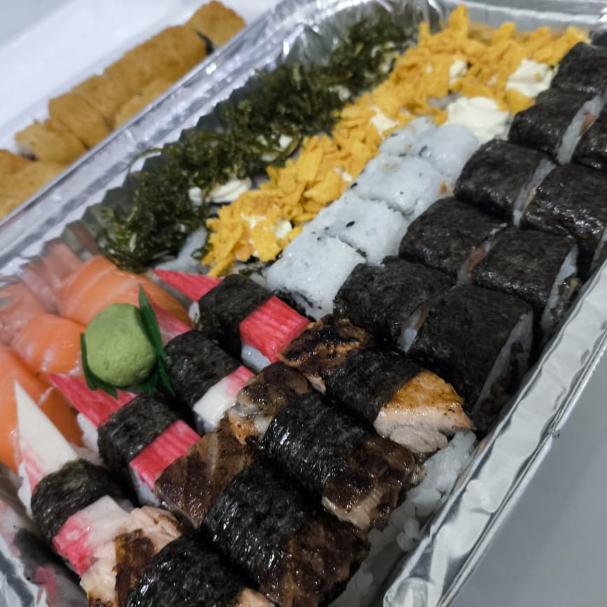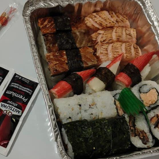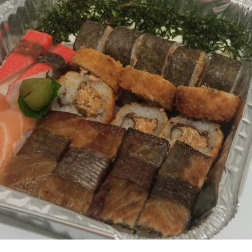 3 niguiri salmão maçaricado , 3 niguiri kani , 3 niguiri skin , 5 uramaki skin , 5 maki skin , 2 rolinhos salmão