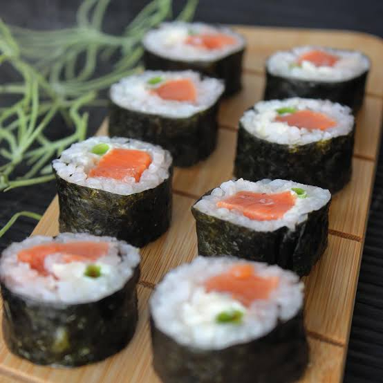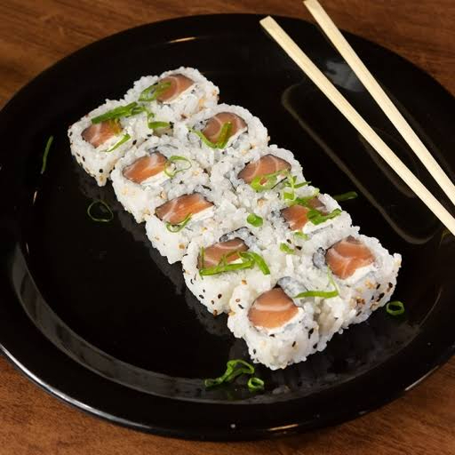 base de arroz , cream cheese , cebolinha , salmão grelhado com cheddar
