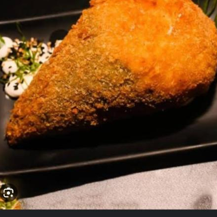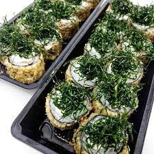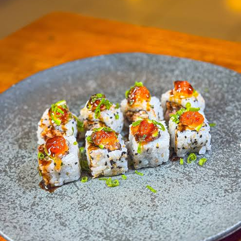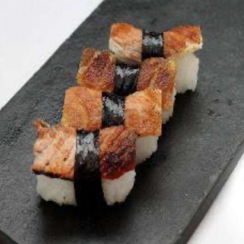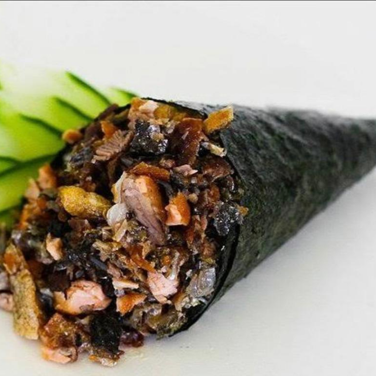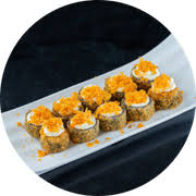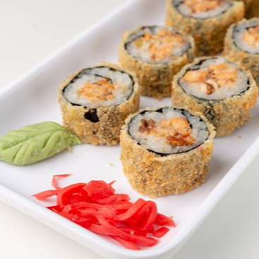 base de arroz empanado com farinha panko , com recheio opicinal de salmão cream cheese e cebolinha ou salmão grelhado com acrescimo de doritos e couve crispy