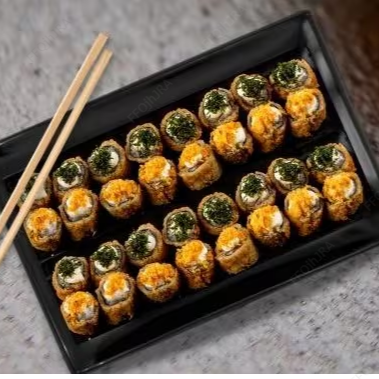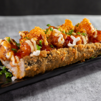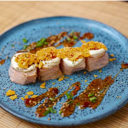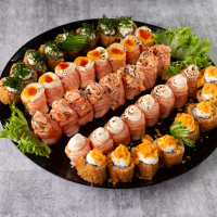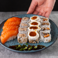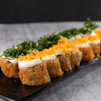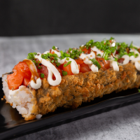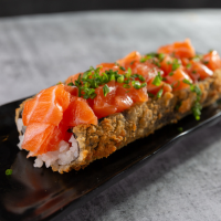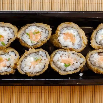 Sushi enrolado com alga por fora, recheio de Salmão com Cream Cheese, empanado e frito. Quantidade: 8 unidades.