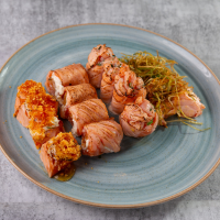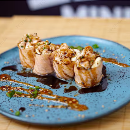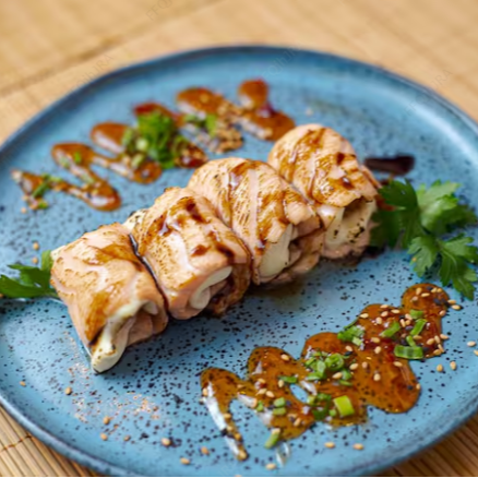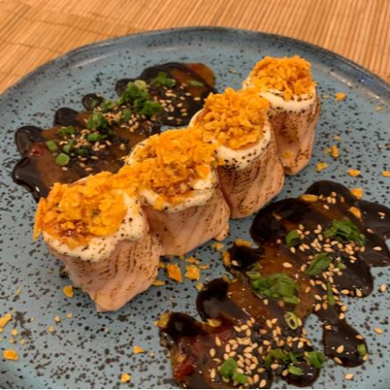 Porção com 4 unidades de fatia de salmão enrolada no tartar de salmão maçaricado. Obs: sem arroz. Não acompanha shoyu, teriyaki, porta shoyu e hashi. Obs: não fazemos modificação no combo. #japonesa #chinesa #shoyu #salmão #camarão #sushi #yakisoba #temaki