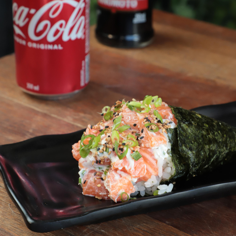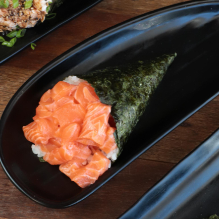 Salmão grelhado, molho tarê, arroz shari e salpicado com cebolinha, envolto no nori (folha da aloga) em formato de cone.