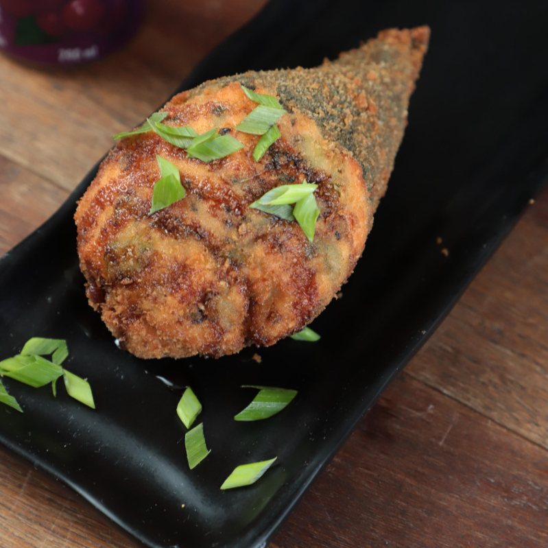 Temaki empanado com cream cheese , arroz shari e salpicado com cebolinha, envolto no nori (folha de alga) em formato de cone.