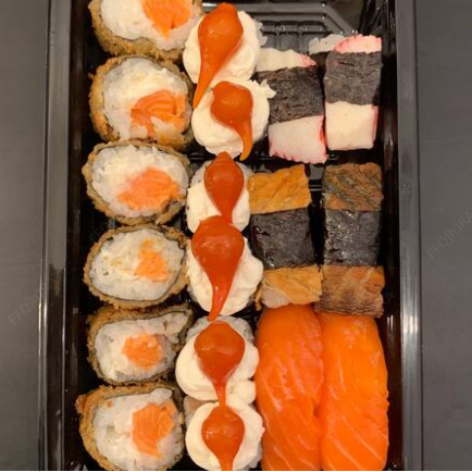 Combinado Salmão Mix (46 peças) com 5 niguiris de salmão, 5 sashimis de salmão, 4 uramaki filadélfia, 4 uramaki califórnia, 4 uramaki skin, 8 makis de salmão, 8 hot doritos e 8 hot couve. Atenção: Não enviamos shoyu, teriyaki, porta shoyu e hashi. Obs: Não fazemos modificação no combo. #japonesa #chinesa #shoyo #salmão #camarão #suhi #yakisoba #temaki