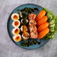 Porção com 4 unidades de camarão cozido com gergelim, enrolados em uma fatia de salmão. Obs: não contém arroz.
