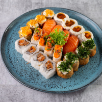 Combo Promocional (40 peças) com 8 uramakis california, 8 uramakis skin, 8 uramakis de salmão grelhado, 8 hots com geleia sweet, 4 hot doritos e 4 hot couve. Serve até 4 pessoas. Não acompanha shoyu, teriyaki, porta shoyu e hashi. Obs: Não fazemos modificação no combo.