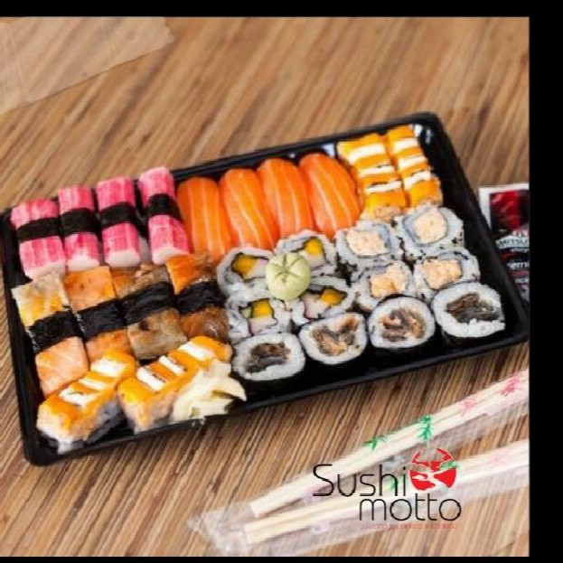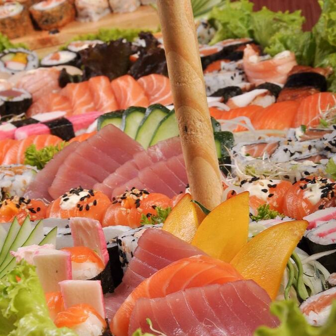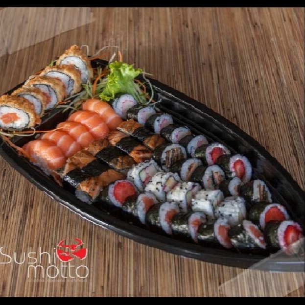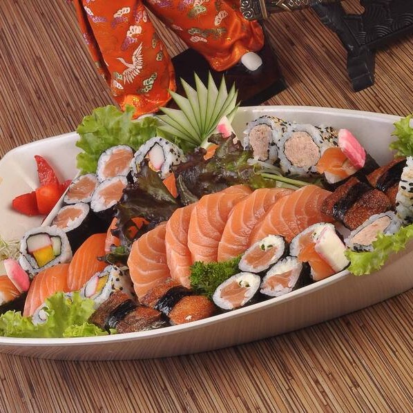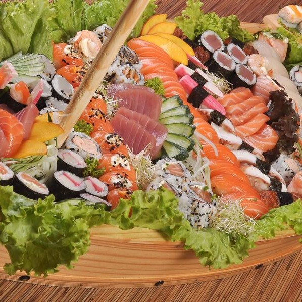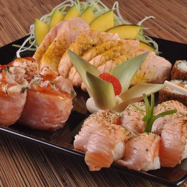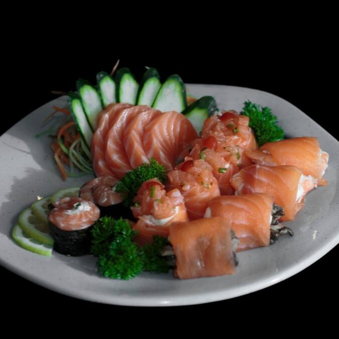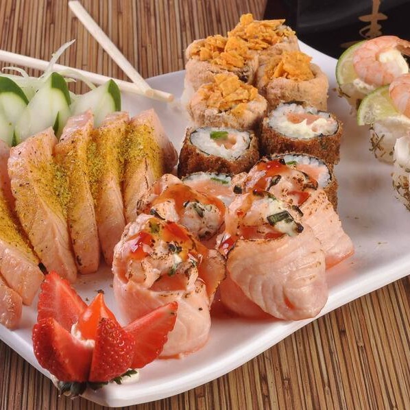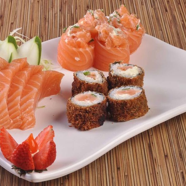 6 sashimis variados (salmão, atum e peixe branco), 6 sushis salmão, 4 sushis pele, 4 filadélfia, 4 maki salmão, 4 ura skin, 4 califórnia e 4 higawere.