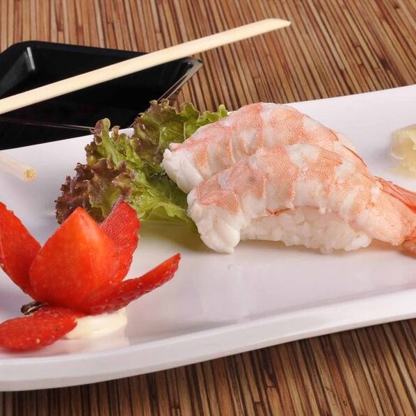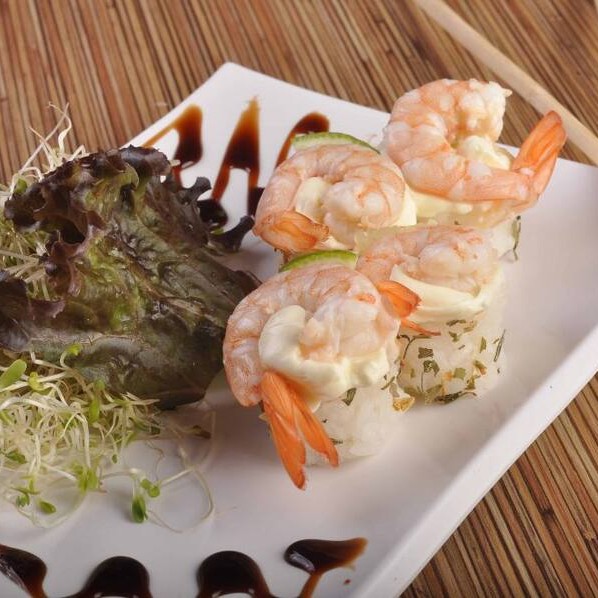 4 niguiri camarão, 4 sashimi salmão. 4 up camarão. 4 ebisake