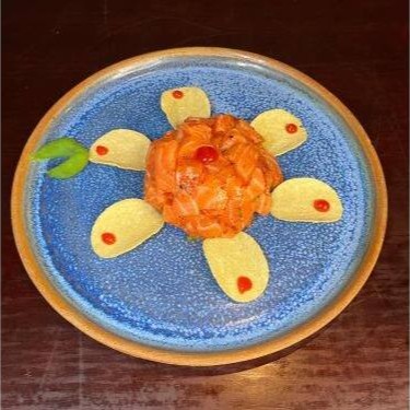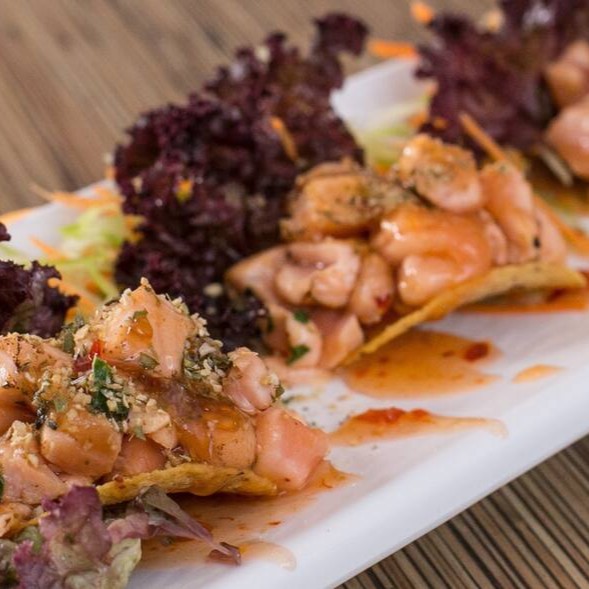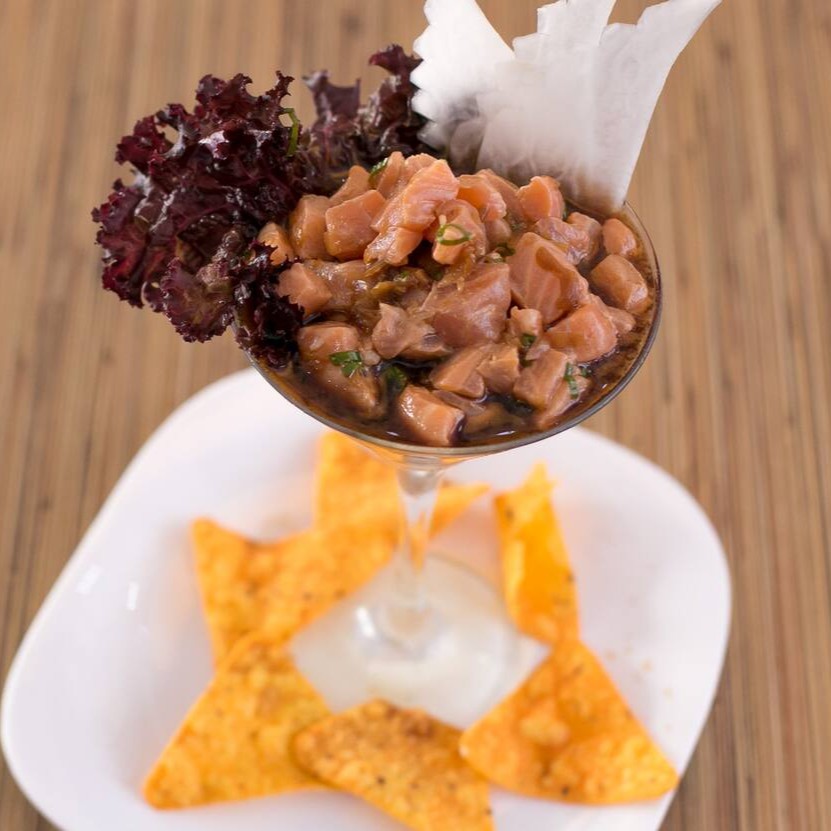 Salmão Cortado Em Cubos,Com Pimenta Togarashi,Sriracha E Pringles