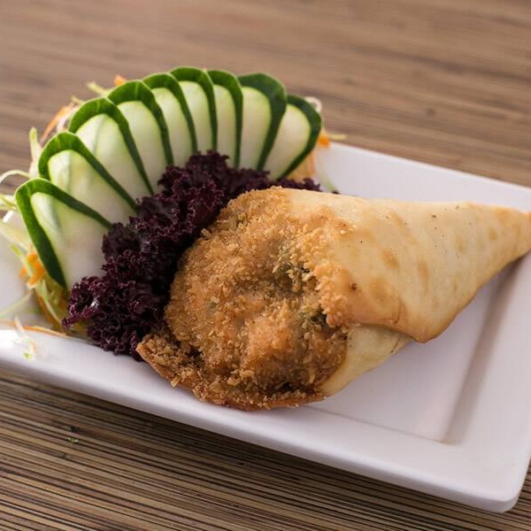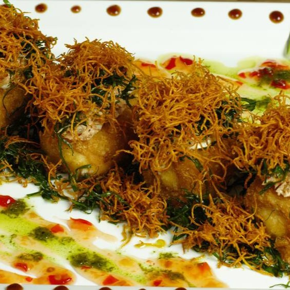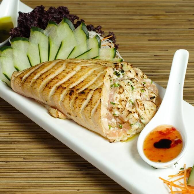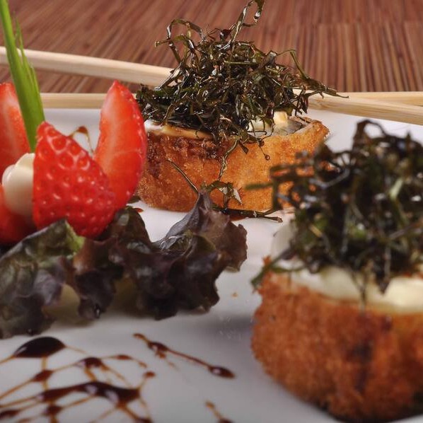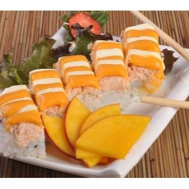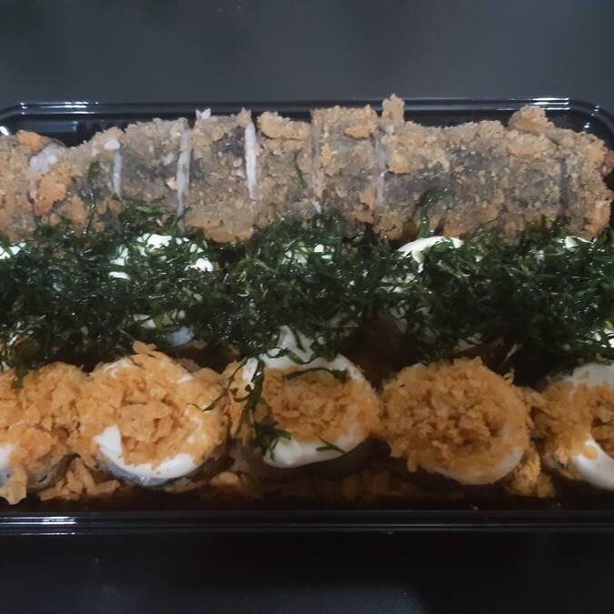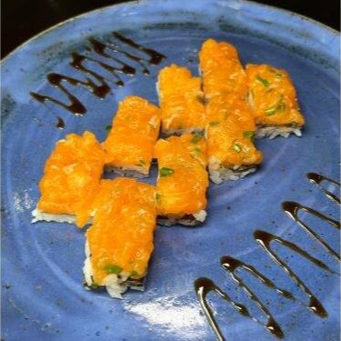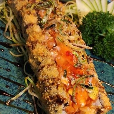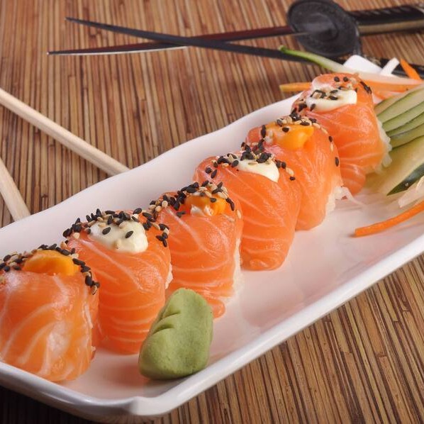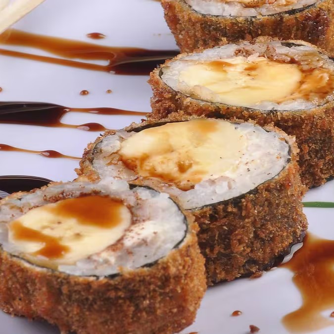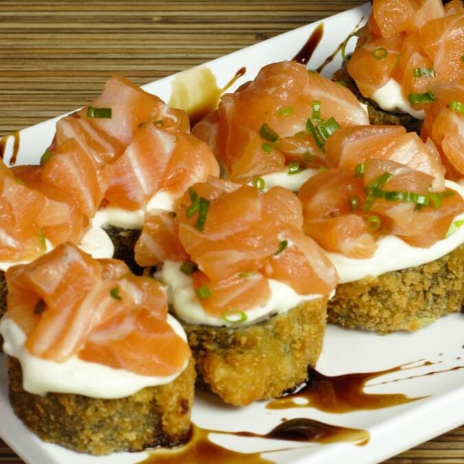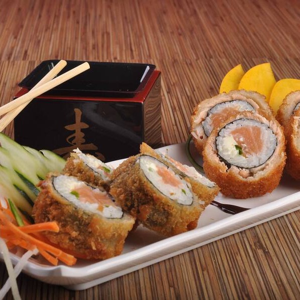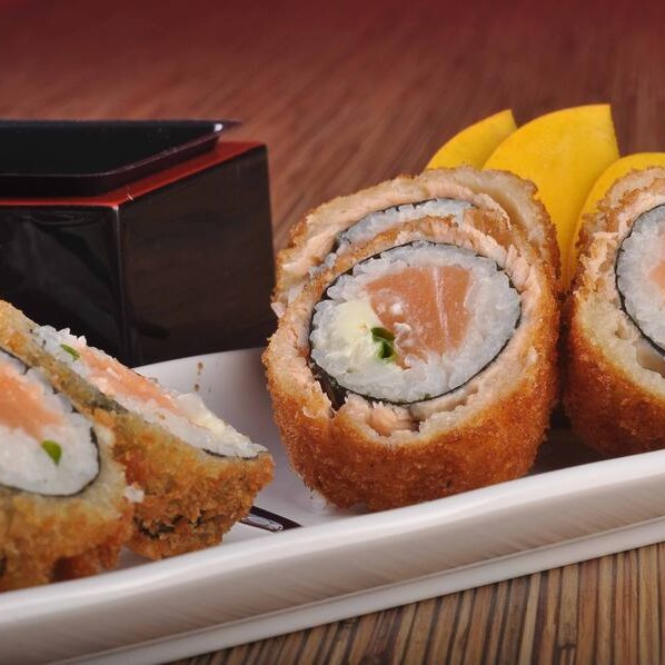 Salmão, cream cheese, cebolinha, arroz, molho sweet sauce, teriaki, alho poró crispy, empanado e frito