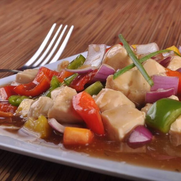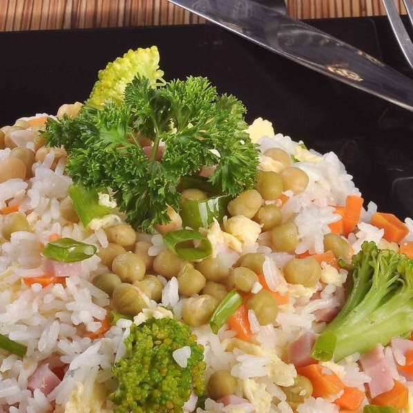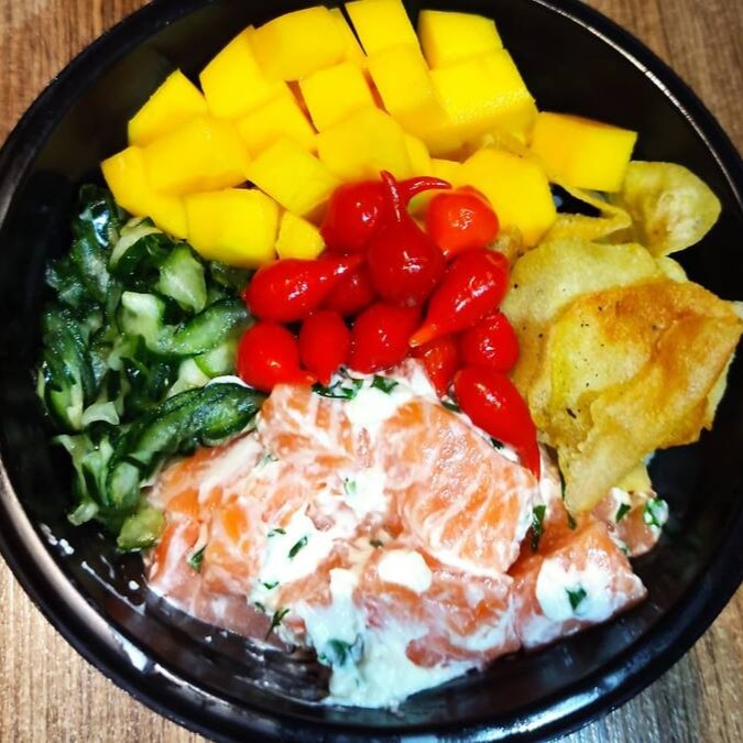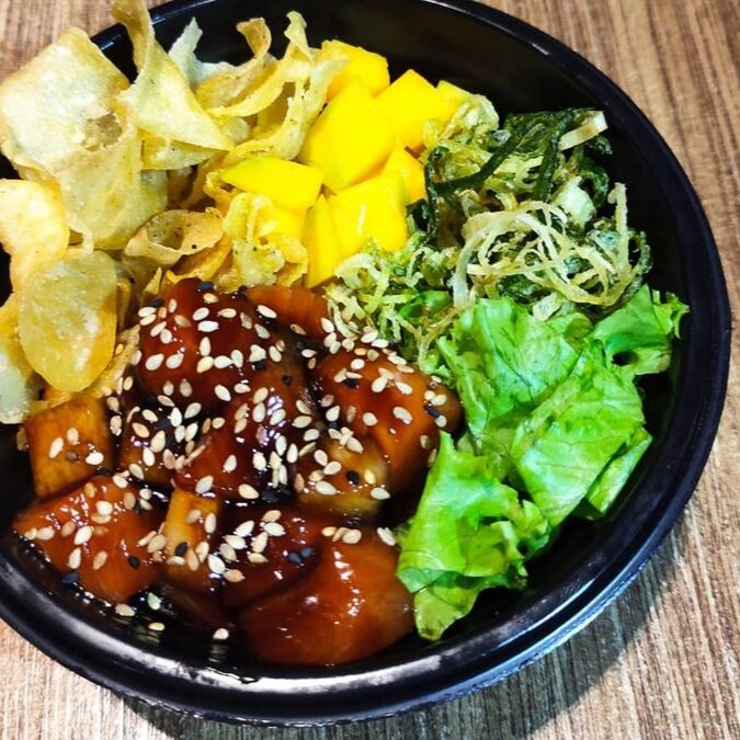 Arroz, salmao, abacaxi, teriaki, manga, crispy de batata doce, alho poró, alface e gergelim