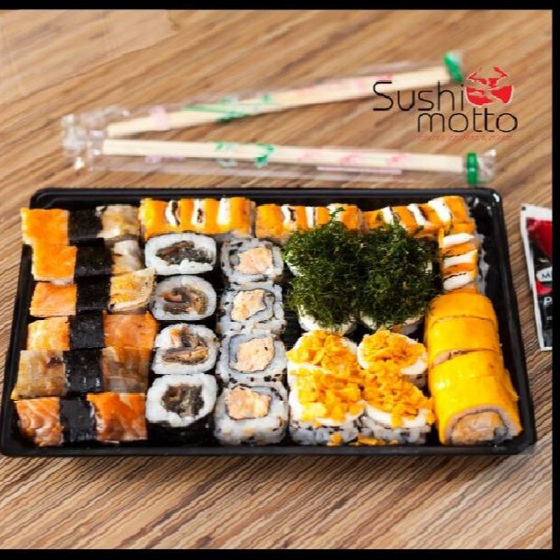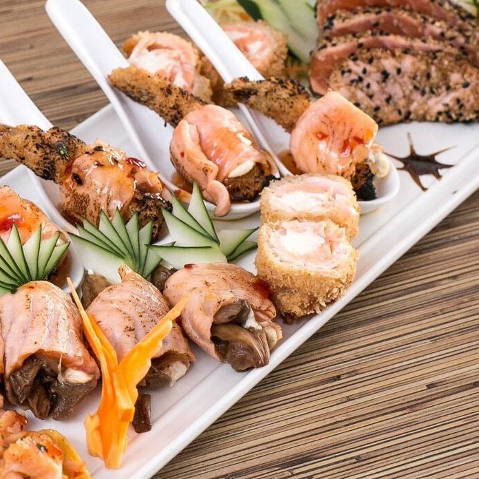 4 sushi salmao, 4 sushi kani, 4 sushi nokawa, 5 maki filadelfia, 5 maki pimenta biquinho, 5 maki nokawa, 5 uramaki skin