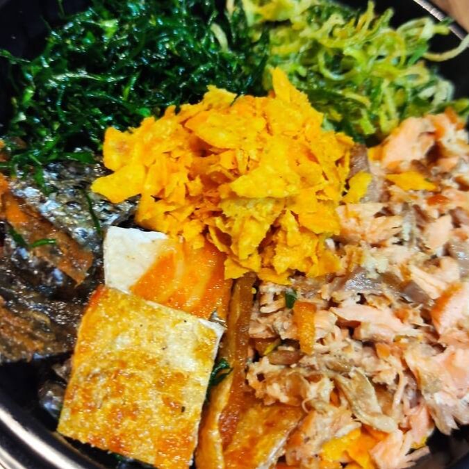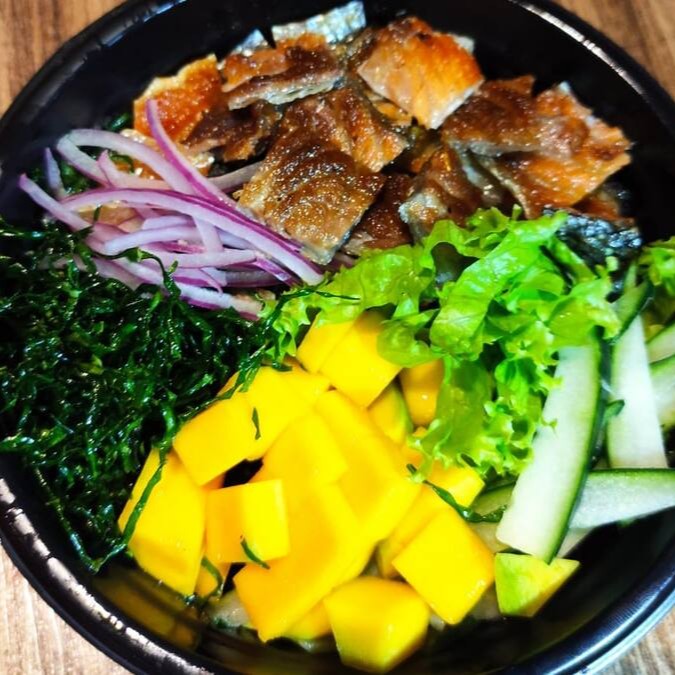 Arroz, pele de salmão, manga, pepino, crispy de couve, cebola roxa, alface