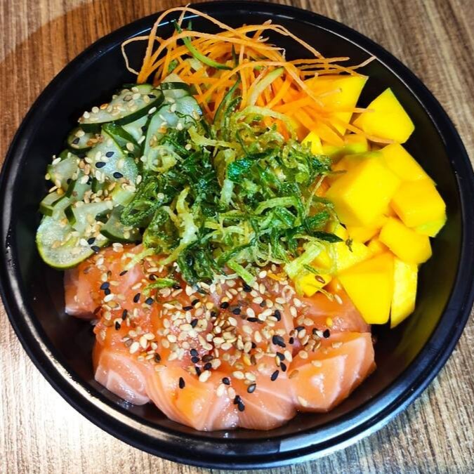 Arroz, Salmão, Manga, Sunomono, Cenoura, Crispy de Alho Poró e Gergelim