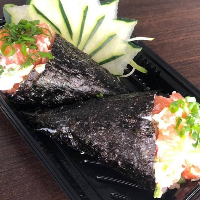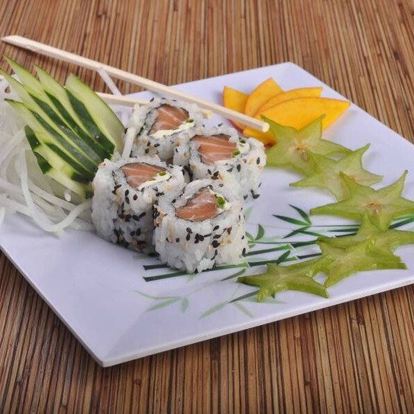 Arroz, salmão, cream cheese, cebolinha, sunomono, crispy de alho poró, gergelim, abacate, pimenta biquinho