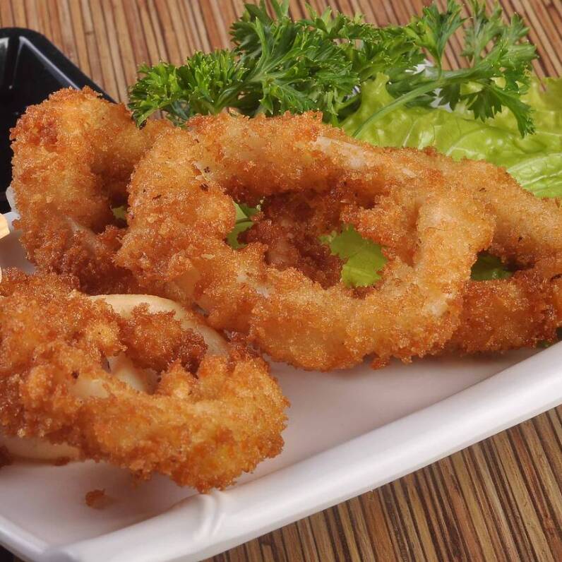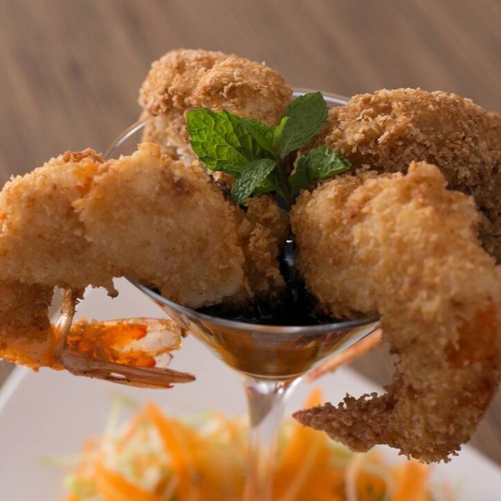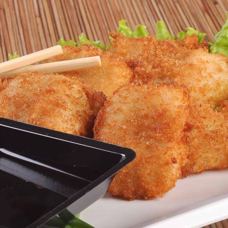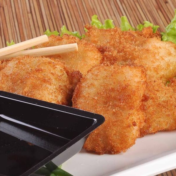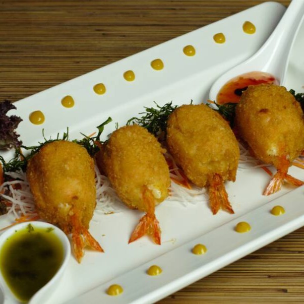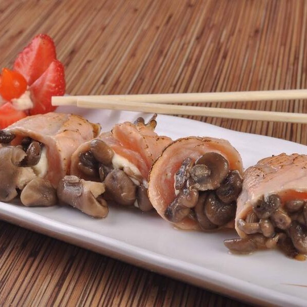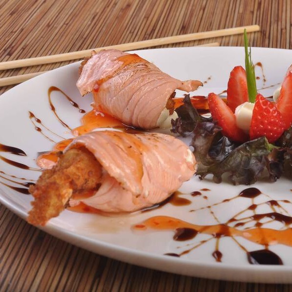 Camarão e cheese envolto em lâmina de salmão empanado.