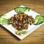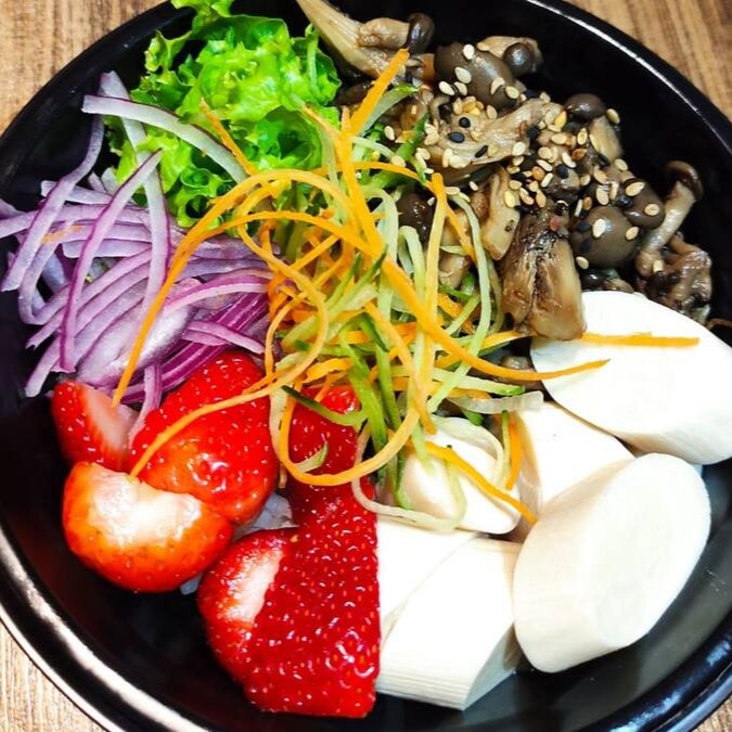 Arroz, shimeji, morango, mix de folhas, palmito, gergelim, cenoura e cebola roxa