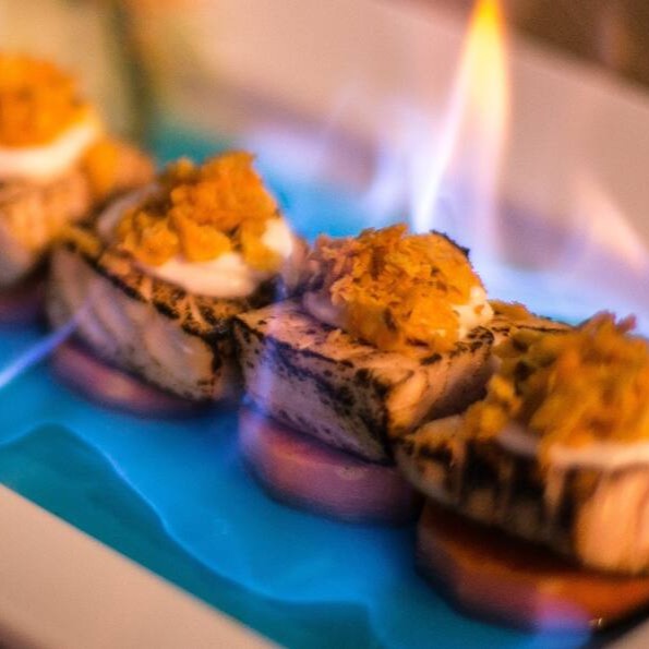 6 sashimis flambado, 4 gunkan flambado. 4 hot filadélfia e 6 sushis salmão flambados.