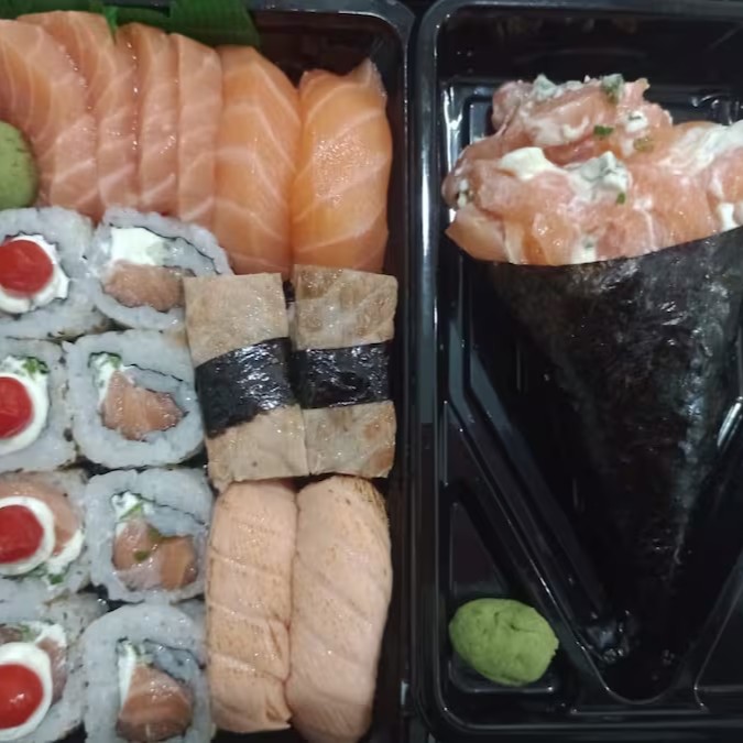 O 'Osaka 18 peças' é um verdadeiro deleite para os amantes de sushi. Este combo deliciosamente curado inclui 3 peças de sashimi de salmão fresco e suculento, equilibrado com 4 peças de nigiri de salmão, cada uma com um toque de wasabi para um toque extra de sabor. Além disso, temos 2 joys de salmão com cream cheese cremoso e 2 joys de salmão com cheddar rico e derretido, proporcionando uma mistura perfeita de sabores. Adicione a isso 2 joys de salmão picante para um pouco de calor, e 5 hossomakis Filadélfia, enrolados à perfeição. Cada peça é uma explosão de sabor, fazendo deste combo uma escolha irresistível.