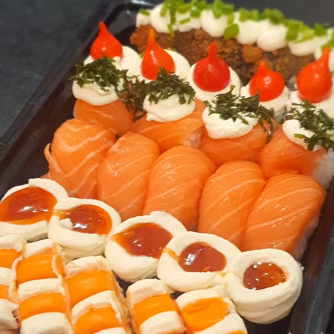 Encante-se com nosso Combo Salmão de 32 peças, uma perfeita seleção da culinária japonesa. São 8 deliciosos Djoys recheados com suave creme cheese, 8 Djoys com tartar de salmão fresco e irresistível, 8 Djoys com uma inigualável geleia sweet. Para finalizar, desfrute de 8 peças de Niguiris de salmão, delicadamente moldados à mão. Experimente essa explosão de sabores e texturas da nossa categoria 'Combos Crus'.