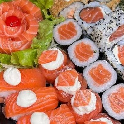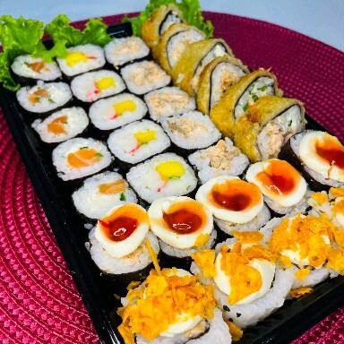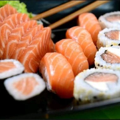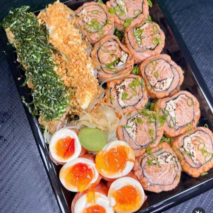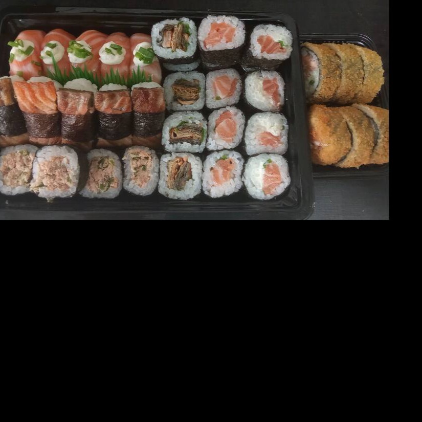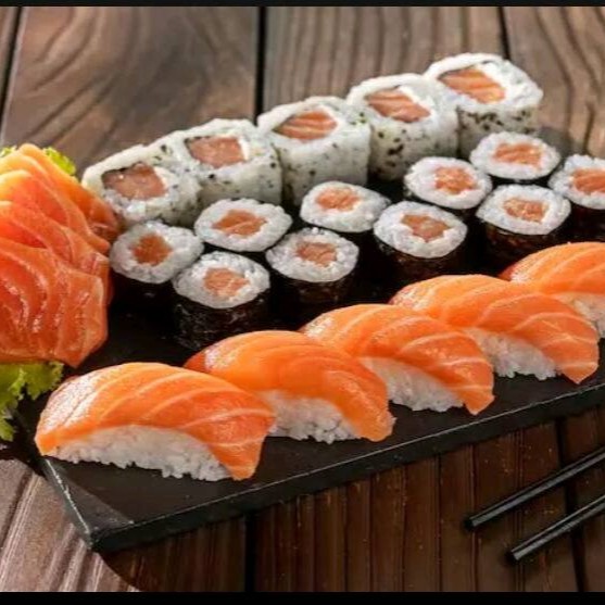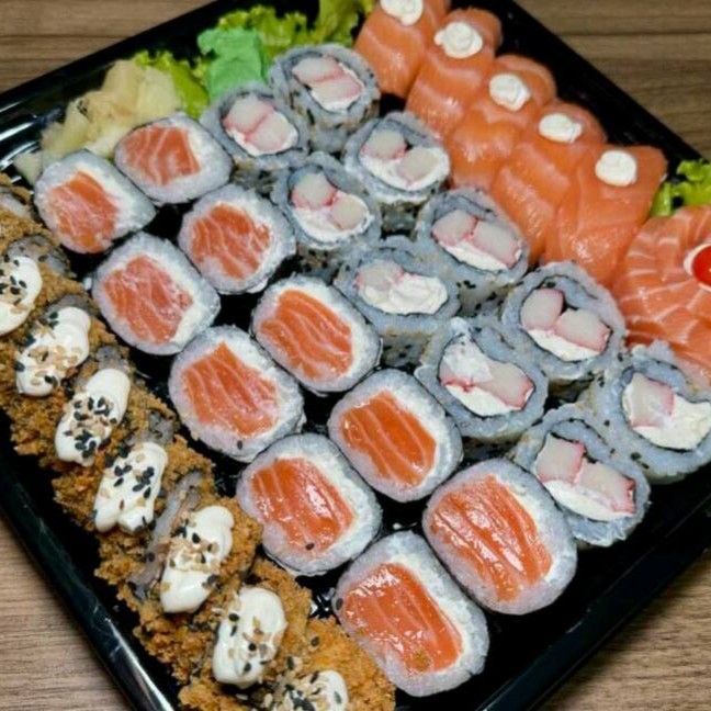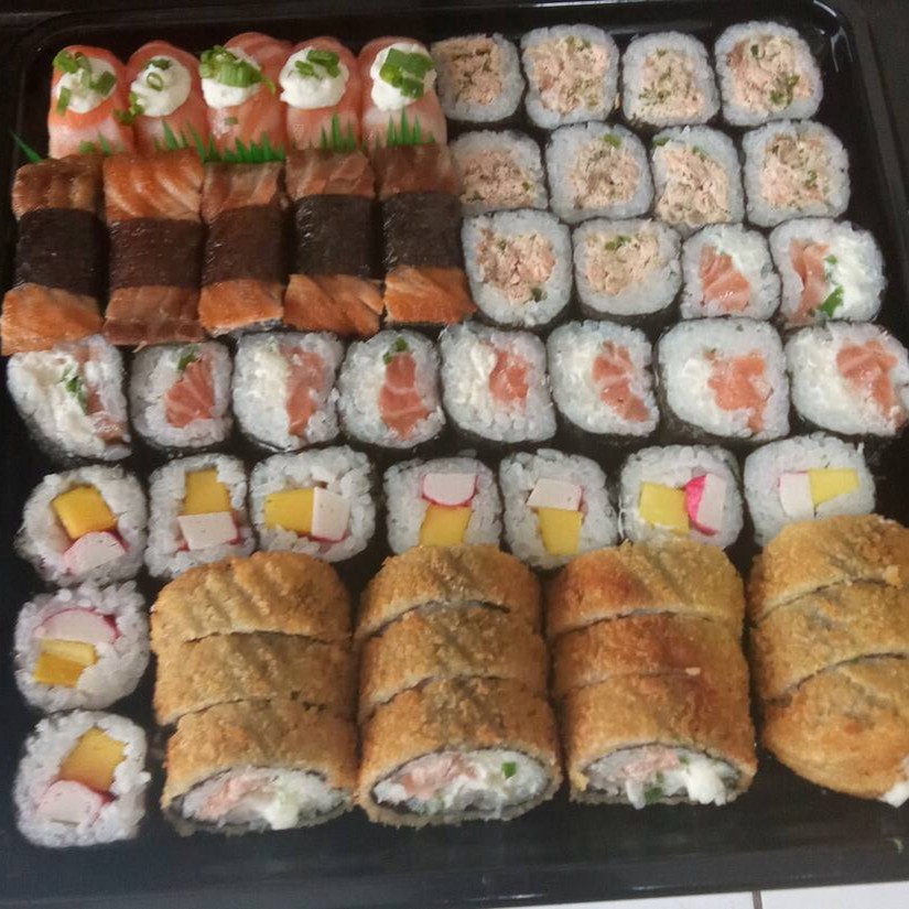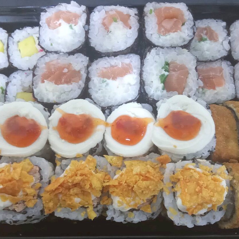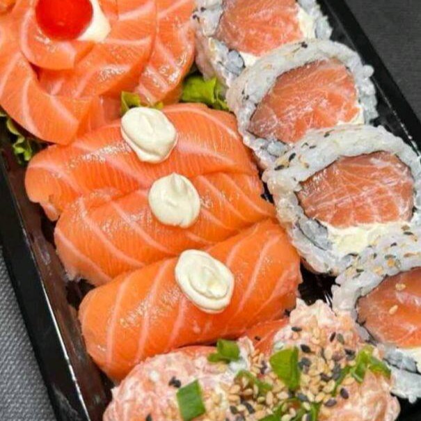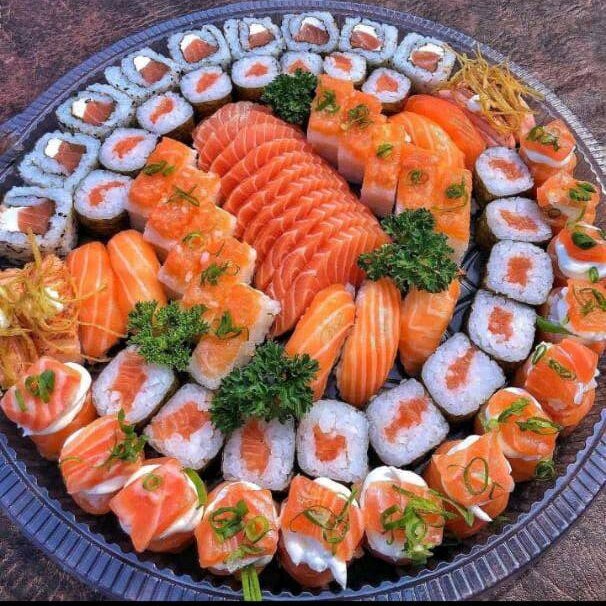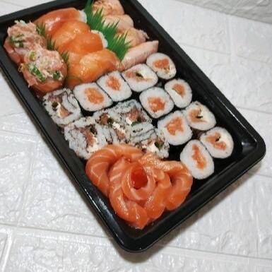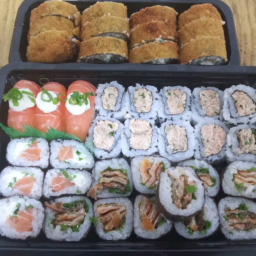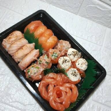 3 niguiris de salmão, 5 makes Filadélfia, 10 makes skin,10 Huramakes de salmão grelhado,12 hots Filadélfia.