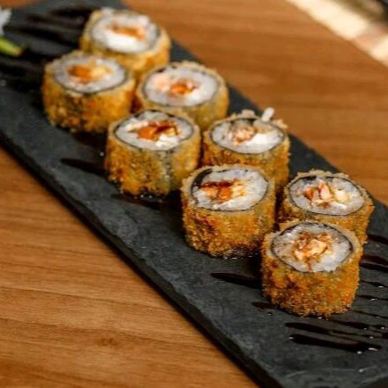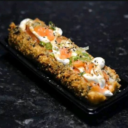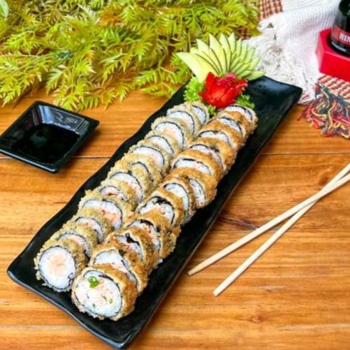 Nori, arroz, Empanado na farinha panko e frito,salmão fresco creme chesse cebolinha gergilim.