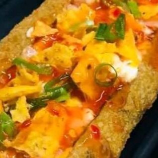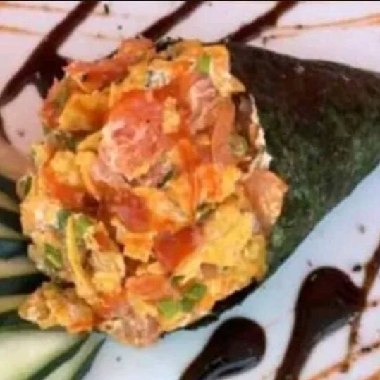 Make empanado e frito,salmão fresco, creme chesse, cebolinha e geleia de pimenta e Doritos.