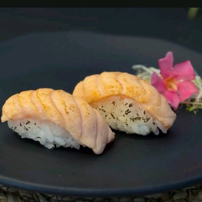 Arroz, uma leve fatia de salmão fresco e maçaricado.