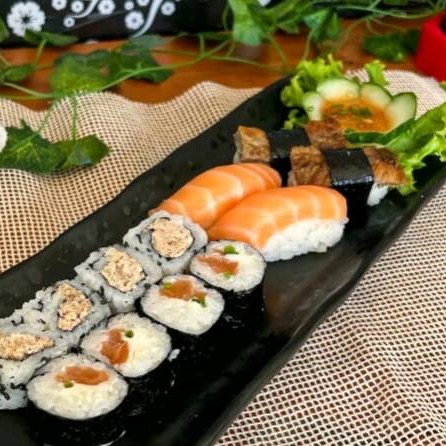 2 niguiris de salmão, 2 niguiris skin, 5 makis filadélfia e 5 makis grelhados.