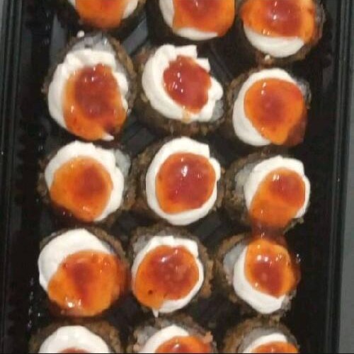 Arroz uma leve fatia de salmão fresco creme chesse e geleia de pimenta.
