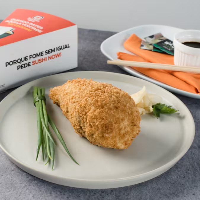 Salmão empanado, cream cheese e cebolinha, arroz. >>> Não Acompanha Molhos E Nem Hashi!