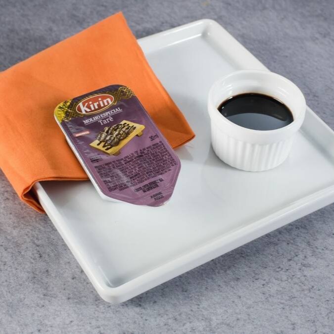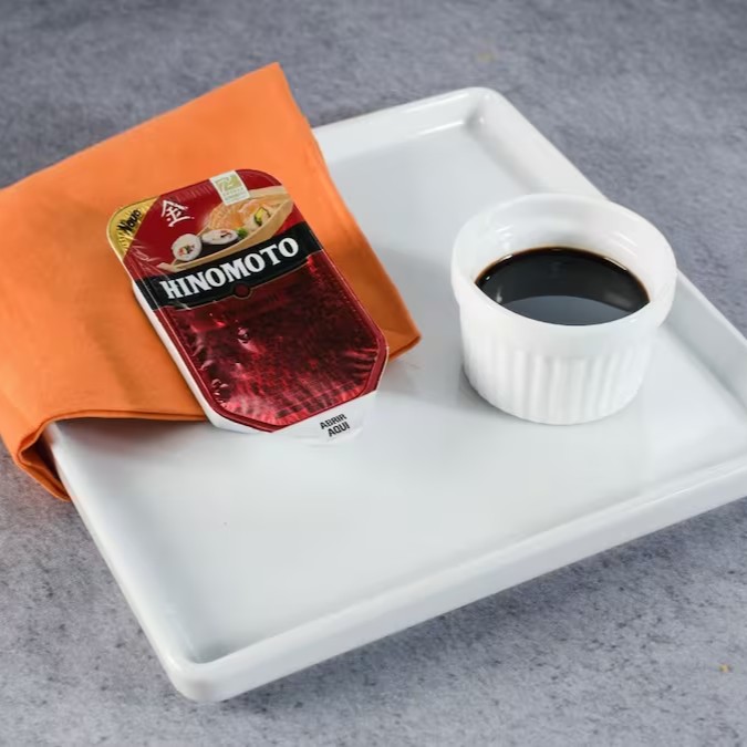 1 shoyu, 1 tarê, 1 sachê wassabi, 1 sachê gengibre em conserva, 1 hashi.