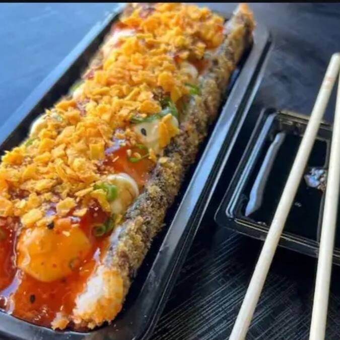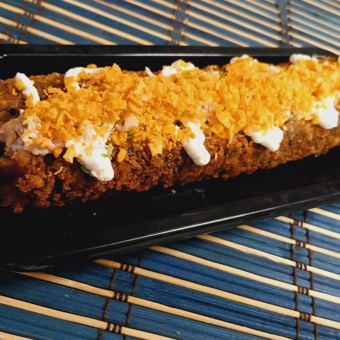Big Hot empanado na farinha Panko e recheado com salmão super fresco em cubos, cream cheese, cebolinha e gergilim. Com uma deliciosa coberta de geleia doce de pimenta e Doritos.