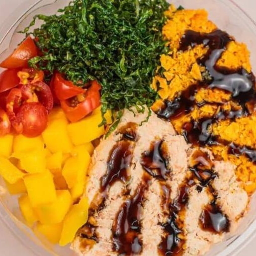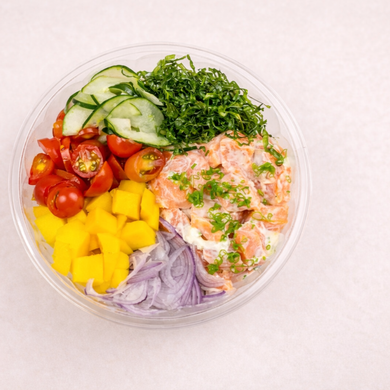 Poke de Salmão Grelhado feito com: Arroz, Patê de Salmão Grelhado, Crispy de Couve, Tomate Cereja, Manga e Doritos.