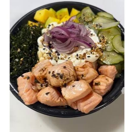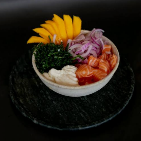 Poke Salmão Flambado feito com: Arroz, Salmão maçaricado, Cebola Roxa, Manga, Crispy de Couve, Sunomono, Cream Cheese e finalizado com Gergelim.