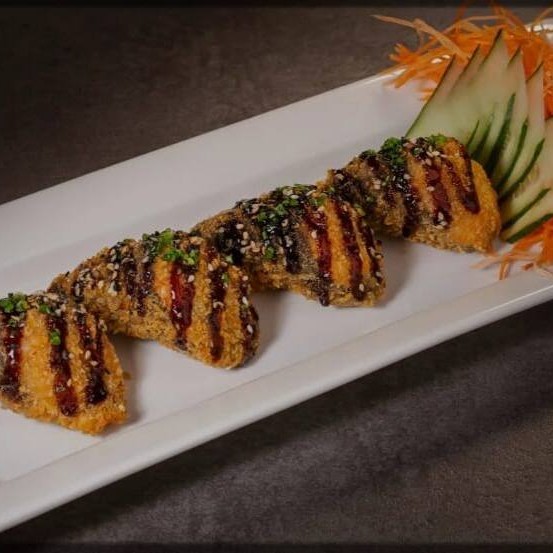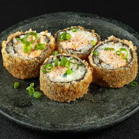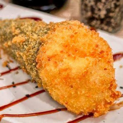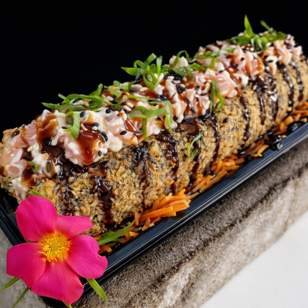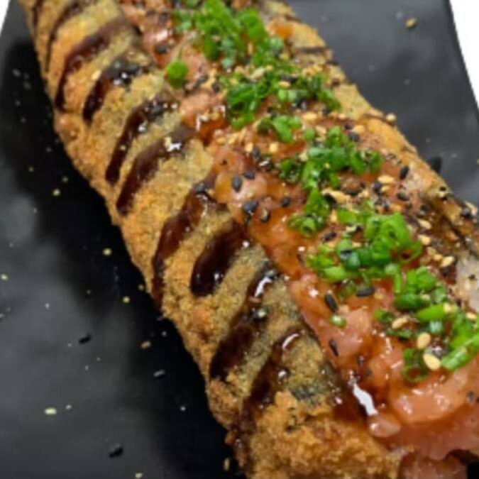 Big Hot empanado na farinha panko e recheado com cream cheese, salmão em cubos flambados e finalizado com molho tarê e cebolinha.