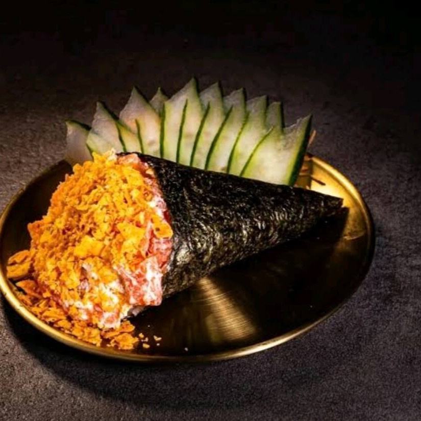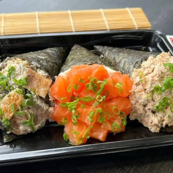 1 Temaki de salmão grelhado com cream cheese, cebolinha e crispy de couve;