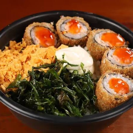 Poke Kani Philadelphia feito com: Arroz, Kani, Couve Crispy, Tartar de Salmão e Sunomono.
