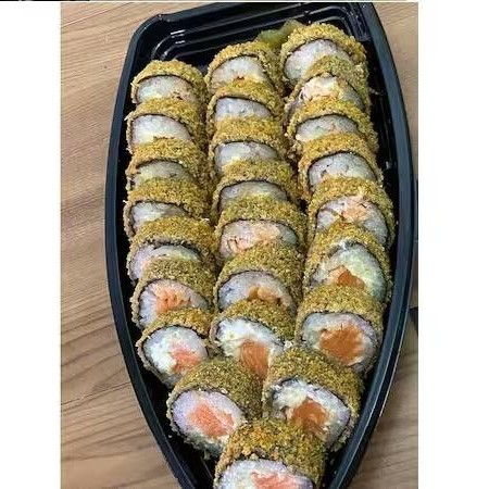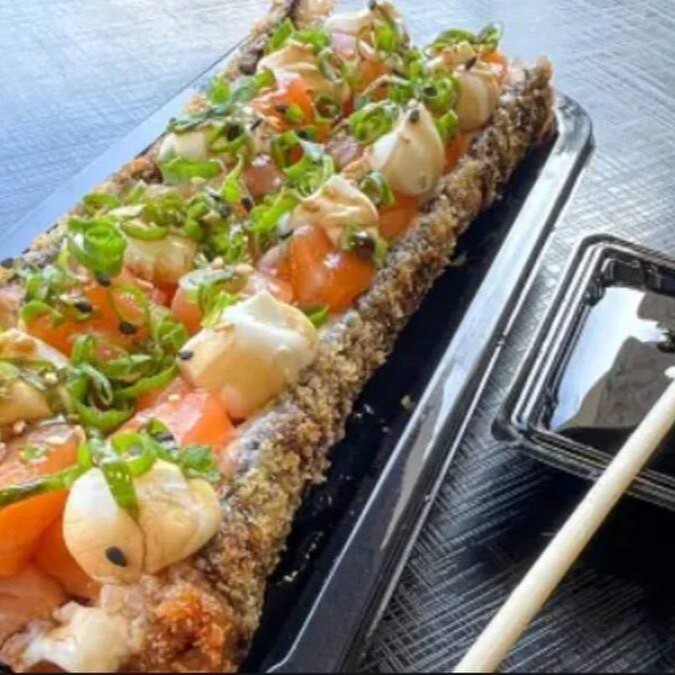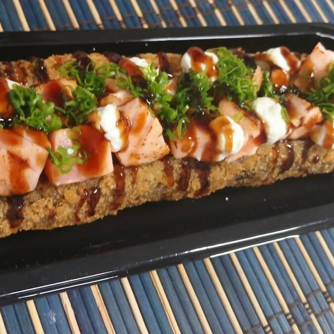 Sushi de salmão grelhado, cream cheasse e arroz oriental. Envolto em alga marinha crocante.